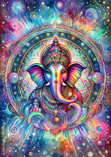 ganesh, cosmic, mandala, hindu, god, elephant, deity, spiritual, colourful, meditation, yoga, illustration, watercolor, religion, culture, india, tradition, wisdom, prosperity, good luck, chakra, energy, aura, nirvana, peace, serenity, harmony, balance, vibrant, intricate, detailed, beautiful, art