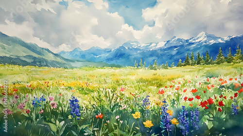 A vibrant watercolor landscape showcasing a colorful meadow filled with wildflowers and majestic mountains in the background.