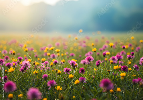 wildflower, meadow, sunrise, dew, morning, nature, landscape, flower, purple flower, yellow flower, bloom, spring, summer, field, floral, plant, botanical, beautiful, scenic, vista, countryside, rural, environment, ecosystem, flora, vegetation, grass, green, colours, vibrant, fresh, calm, serene, peaceful, tranquil, beauty, wonder, light, sun, ray, hazy, mist, background, horizon