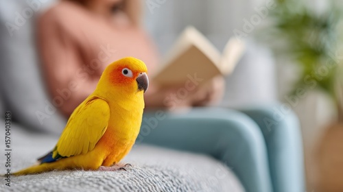 bird, pet, parrot, yellow, cosy, living, room, sofa, owner, reading, indoor, companionship, animal, friendship, relaxation, home, colourful, interaction, nature, happiness, warmth, lifestyle, leisure, attentive, affectionate, joyful, calmness, comfort, care, bond, domestic, cute, cheerful, personality, entertainment, company, scene, charme, soft, warm, colours, book, peaceful, moment, engagement, wildlife, joy, harmony, family