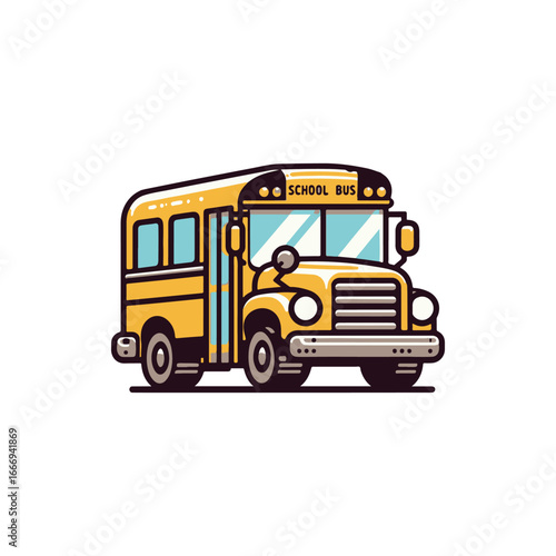 A vibrant yellow school bus parked at a school entrance, with children playing nearby