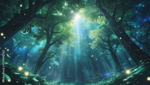 forest, tree, sunlight, canopy, nature, wood, light, green, blue, fantasy, magical, dreamy, aethereal, peaceful, serene, tranquil, calm, relaxing, mystical, enchanted, fairy tale, artistic, illustration, scenic, landscape, environment, foliage, tree trunk, branch, leaf, atmosphere, sparkling, shining, radiant, glow, vista, timberland, dreamlike, beautiful