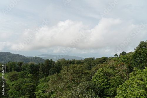 A view from Gunung Raya on Langkawi, showing vast lush forests and distant misty mountains under a cloudy sky.