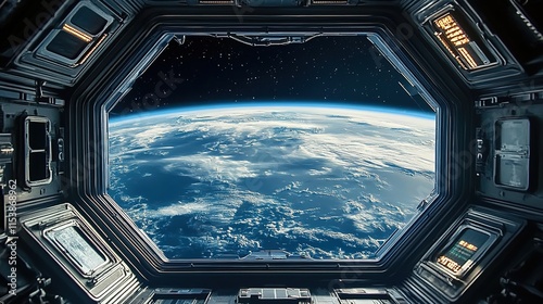 space, station, view, earth, window, interior, deep, grey, brown, hue, metallic, frame, surrounding, ocean, blue, water, land, green, continent, star, scattered, night, sky, cosmic, science, fiction, atmosphere, exploration, theme, universe, adventure, horizon, immensity, futuristic, unknown, mystery, human, endeavour, technology