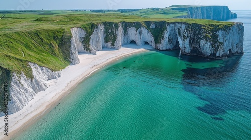 A view of a beach with white cliffs in the background