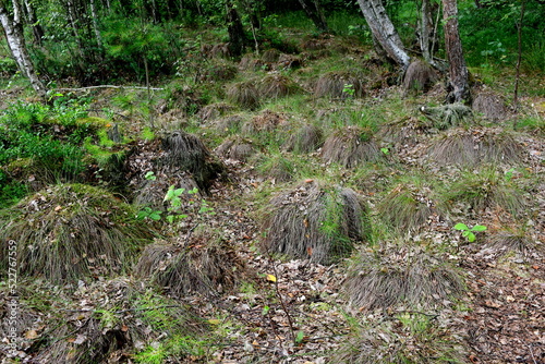 A view of a dirt path leading through a dense coniferous forest full of trees, shrubs, herbs, and other kinds of flora seen on a sunny summer day in Poland during a countryside hike