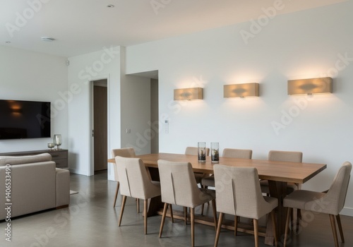 room, dining, table, chair, modern, interior, design, furniture, home, decor, living, house, apartment, wall, light, sofa, television, floor, window, door, glasses, vase, minimalist, contemporary, clean, bright, neutral, beige, wood, style