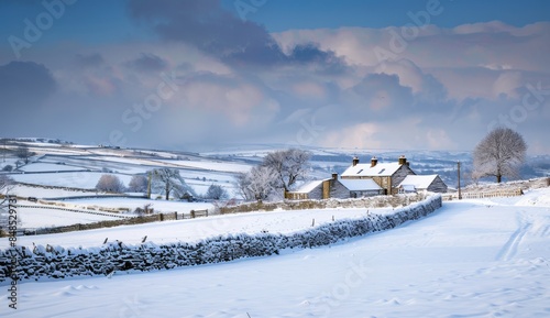 A view of the beautiful winter countryside in Yorkshire, with snowy fields and stone farmhouses