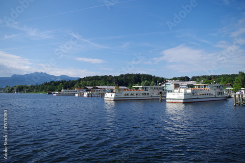 A view on the Chiemsee lake (Bavaria, Germany). There is a harbor with many passenger ships (ferries), as well as forested islands. The sky is very blue, there are scattered clouds.