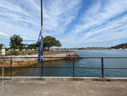 A view up the Parramatta river from the entrance to Cockatoo Island with the Australian flag at half mast. in Sydney, NSW, Australia.