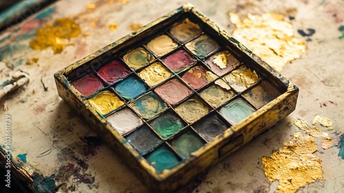 A vintage artist's paint box, worn with time, surrounded by gentle gold leaf details, isolated on a soft cream background