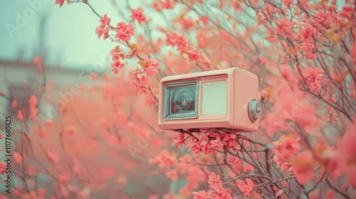 A vintage camera sits amongst pink cherry blossoms, creating a beautiful and nostalgic scene.