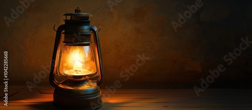 A vintage oil lamp with a warm glow sits on a wooden table against a rustic brown backdrop.