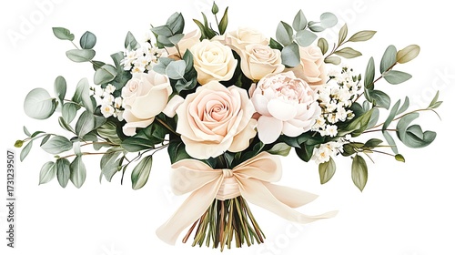 A vintage wedding bouquet illustrated with colored pencils, featuring pale blush roses, ivory peonies, and soft green eucalyptus, tied with a silk ribbon, centered on a clean white background.