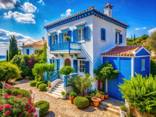 A vintage-photographed, Aegean coastal estate: a blue and white Greek villa showcasing luxury Mediterranean architecture.