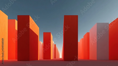 perspective, architecture, city landscape, geometric, abstract, orange, white, building, block, row, light, sunrise, sunset, empty, digital, three-dimensional, modelling, scene, urban, modern, minimalist, future, straight, parallel, simple, colours, gradient, warm, pastel, design, concept, composition, space, exterior, horizon, sky, dawn, dusk, evacuated, rectangle, solid, shape, structure, view