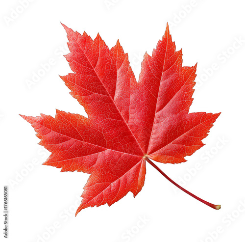 A vivid red maple leaf displaying intricate veins and typical autumn leaf characteristics in natural setting.