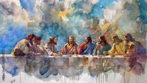 last supper, watercolor, abstract, modern, artistic, vibrant, colourful, traditional, religious, jesus christ, disciple, christian, painting, biblical, spiritual, artwork, celebration, dinner, apostle, symbolic, communion, aethereal, high-coloured, innovative, creative