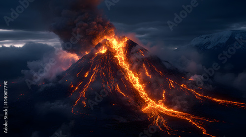 A volcanic eruption releases glowing lava that flows down the mountain side, with cracks and fissures creating a fiery display in the dark of night.