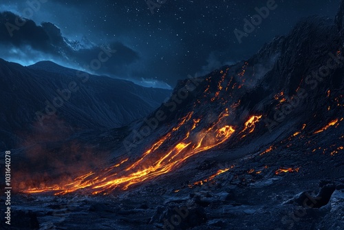 A volcanic landscape with lava flowing down the side of a mountain at night.