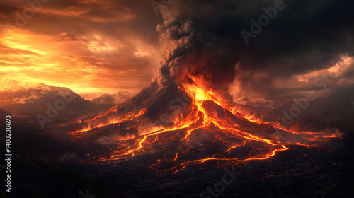 A volcanic mountain range with glowing lava streams flowing through cracks in the earth, dark smoke plumes rising into the sky and fiery orange skies in the background.