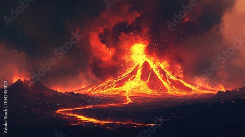 volcano, eruption, lava, fire, mountain, nature, magma, heat, smoke, ash, danger, power, force, energy, explosion, hot, red, orange, dark, sky, landscape, rock, molten, flow, destruction, earth, geology, disaster, scenery, dramatic, intense, natural, beautiful, catastrophy, incandescent, geothermal, tectonic, violent, awe, destructive, fiery, inferno, geologic, terrain, geologic
