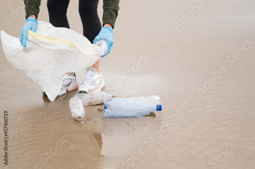A volunteer collects used plastic bottles and other rubbish in a large white bag on the beach. Close-up. Minimalism. Environmental protection. Environmental and social issues.