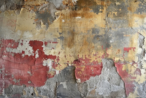 A wall with red and yellow peeling paint, showing layers of history, Peeling paint revealing layers of history on the walls
