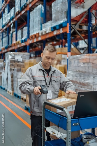 A warehouse stock engineer man scanning a package with a barcode scanner. He is checking goods in transportation and distribution in a warehouse.