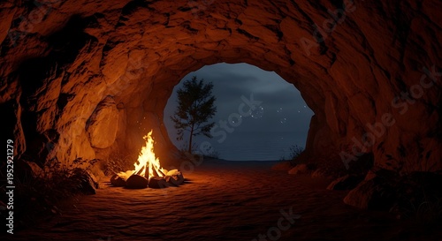 campfire, cave, entrance, flames, light, darkness, sand, rock, earth, horizon, tree, sky, cloud, dusk, evening, wilderness, nature, shelter, warmth, peaceful, tranquil, solitude, serenity, outdoors, landscape, coast, ocean, seascape, journey, adventure, exploration, discovery, calm, relax, safe, cosy, night, atmosphere, silhouette, shadow, glow, burning, wood, ember, smoke, high-coloured, dramatic, ancient, natural