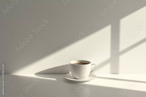 A warm cup of coffee sits alone on a pristine white desk, bathed in soft light