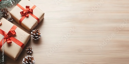 A warm holiday image displaying gifts wrapped in brown paper and red ribbons, surrounded by pinecones on a wooden table, suggesting festive anticipation.
