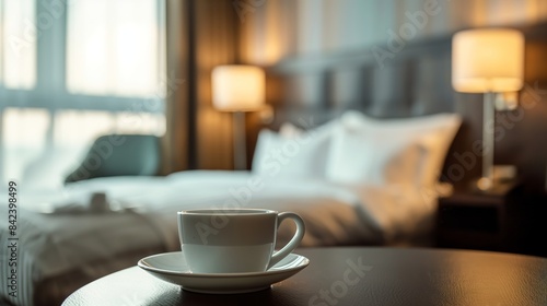 A warm hotel room ambiance with a focus on a cup of coffee on the bedside table, promoting relaxation