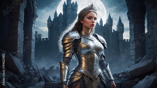 princess, armoring, warrior, castle, ruin, moonlight, mediaeval, character, history, battle, night, strength, defiance, mystery, gaze, determined, expression, face, person, resilience, power, desolation, haunting, beauty, composition, cinematic, dramatic, evening, visual, elegant, graphic, design, concept, scene, scenic, atmospheric, atmosphere, mood, fantasy, imagination, creative, background, illustration