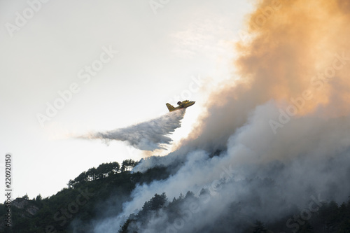 A water bomber aircraft, Canadair, flying over a wildfire in a pine forest