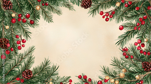 watercolor, illustration, christmas, chaplet, border, pine, branch, berry, red, green, cone, cone, brown, gold, beige, background, holiday, festive, winter, december, decoration, celebration, ornament, graphic, design, art, image, artistic, seasonal, nature, botanical, foliage, abstract, painted, texture, digital