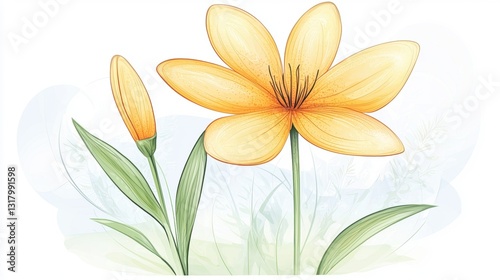 A watercolor illustration of a yellow flower with green leaves and a budding flower, set against a soft, light background.