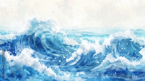 a watercolor painting of a large wave crashing into the shoreline in the ocean