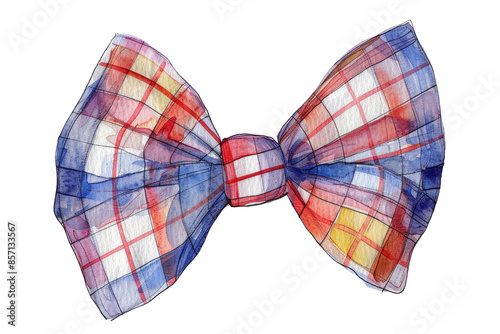 A watercolor painting of a plaid bow tie. The tie is red, white, and blue with a yellow stripe. The tie is tied in a knot and he is a vintage style