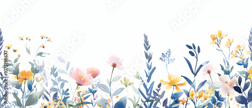 A watercolor wildflower border with various flowers and leaves, white background