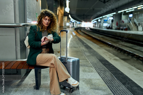 A weary businesswoman with curly hair sits, patiently awaiting her train at the station.