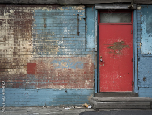 A weathered brick wall with peeling paint and a worn red door, displaying signs of age and neglect.