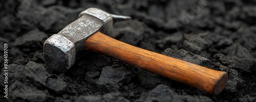 A weathered hammer with a wooden grip lying on rough ground, capturing the essence of hard work and durability