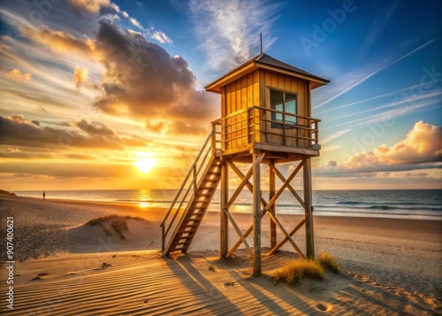 A weathered wooden lifeguard tower number 13 stands sentinel on a picturesque beach in Zeeland, Netherlands, bathed in warm golden light.