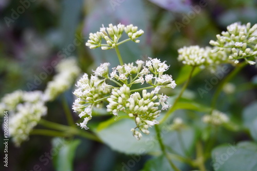 A weed with small white flowers that grow in clusters in the forest.