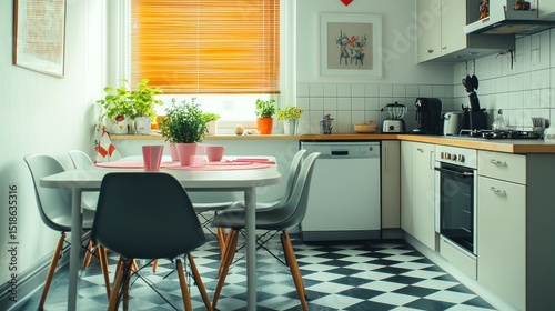 kitchen, dining, area, modern, table, chair, window, light, plant, lighting, home, interior, design, space, decor, style, comfortable, stylish, simple, clean, bright, functional, practical, contemporary, small, apartment, white, grey, wood, pink, orange, pot, window, counter, cabinetry, appliance, floor, tile