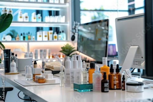 cosmetic, sale, desk, skincare, product, display, plant, brightly, lit, modern, office, organised, beauty, retail, environment, workplace, professional, contemporary, technology, business, clean, design, health, care, variety, selection, product, presentation, aesthetic, stylish, inviting, engaging, shopping, life events, consumer, merchandising, marketing, wellness, luxury, boutique