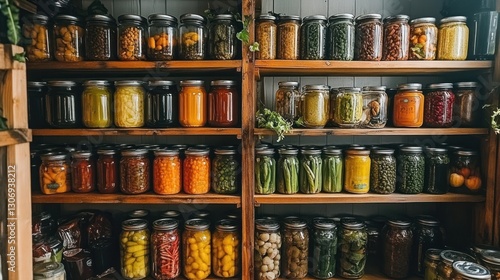 A Well-Stocked Pantry: Rows of Preserved Goods in Glass Jars