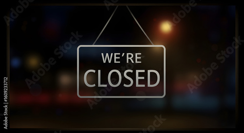 A 'We're Closed' sign hanging on a glass window with a blurred nighttime city street and bokeh lights in the background