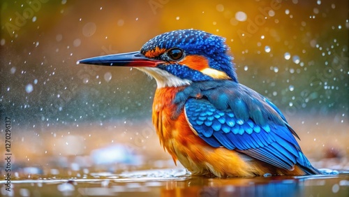 A wet bird with vibrant blue and orange feathers is partially submerged in water, its plumage glistening with dew droplets, blue, feathered creature